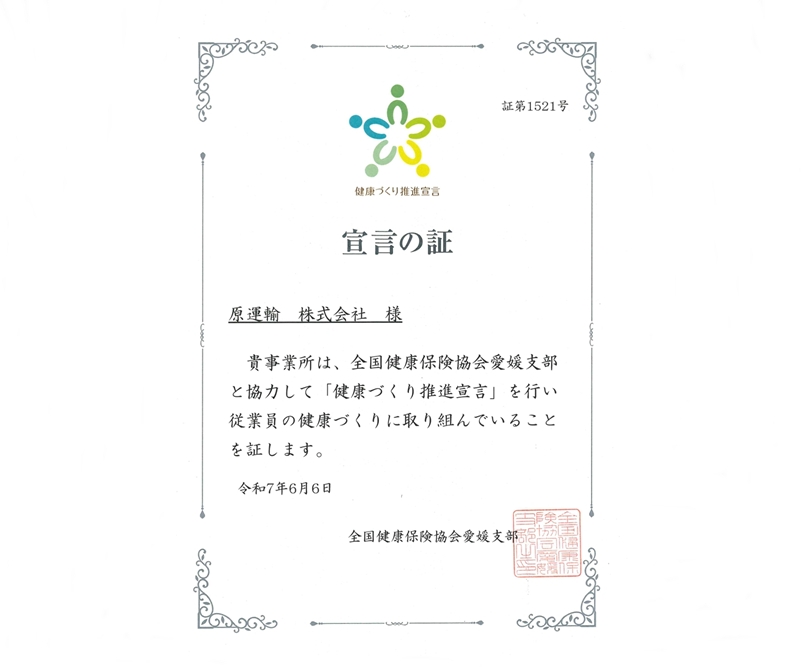 原運輸株式会社は、社員一人ひとりの健康が安全な運送サービスと企業の持続的成長の礎であると確信しております。この度、私たちは「健康づくり推進宣言」を掲げ、社員の心身の健康を支える職場づくりに第一歩を踏み出します。
